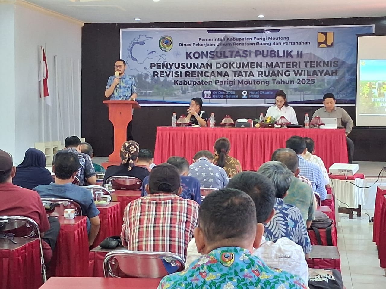 PARIGI MOUTONG – Sekretaris Daerah Kabupaten Parigi Moutong, Zulfinasran membuka secara resmi Konsultasi Publik II Penyusunan Dokumen Materi Teknis Revisi Rencana Tata Ruang Wilayah (RTRW) Kabupaten Parigi Moutong Tahun 2025. Bertempat di aula Hotel Oktaria. Kamis (4/12/2025).